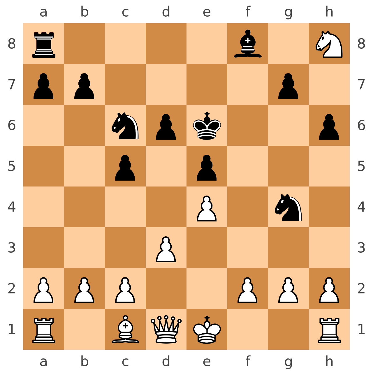 🐊 1. e4 e5 2. Nf3 d6 3. Bc4 Nf6 4. Nc3 c5 5. Ng5 h6 6. Nxf7 Qe7 7. Nxh8 Nc6 8. Nd5 Qe6 9. Nc7+ Ke7 10. Nxe6 Bxe6 11. d3 Ng4 12. Bxe6 Kxe6