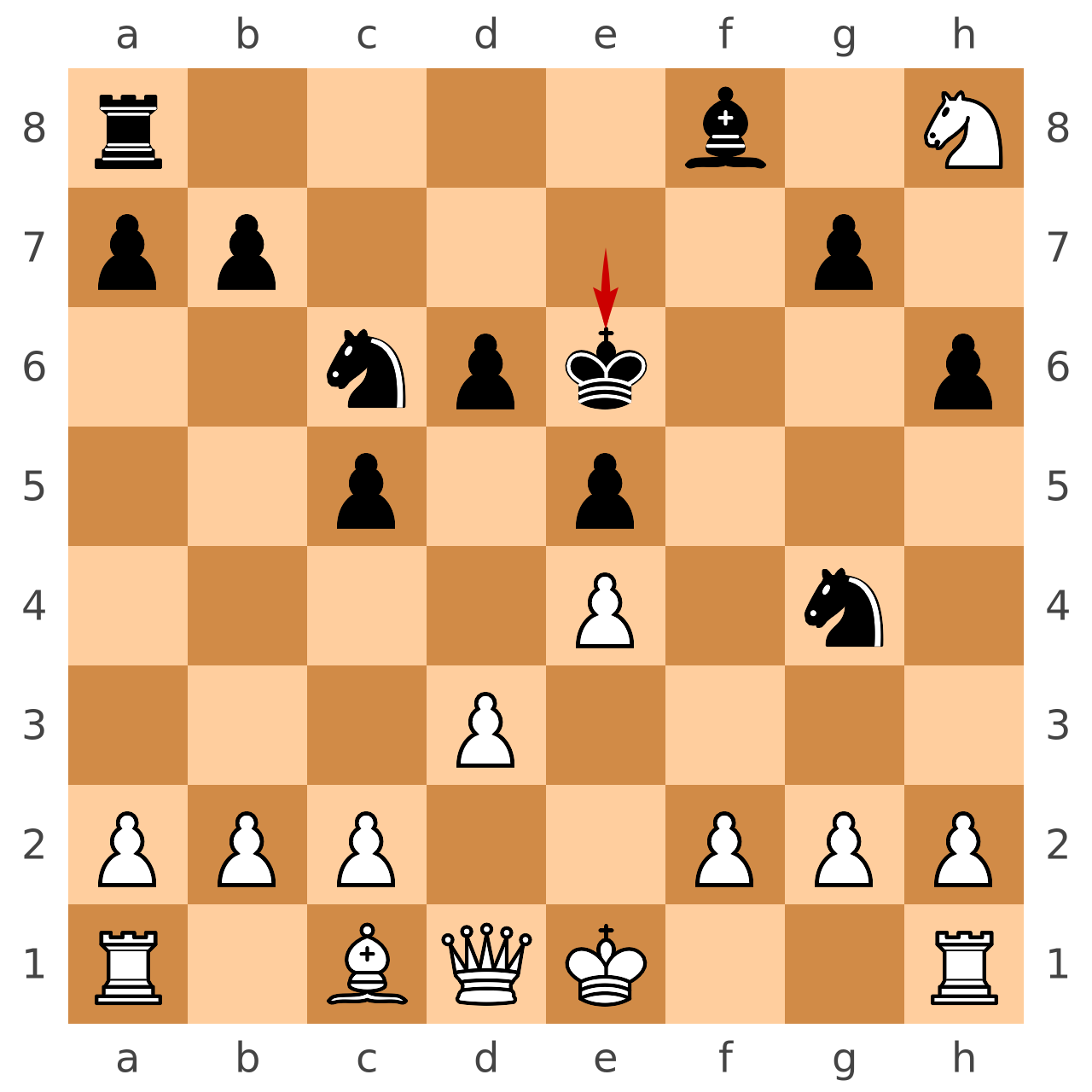 FEN: r4b1N/pp4p1/2npk2p/2p1p3/4P1n1/3P4/PPP2PPP/R1BQK2R w KQ - 0 13